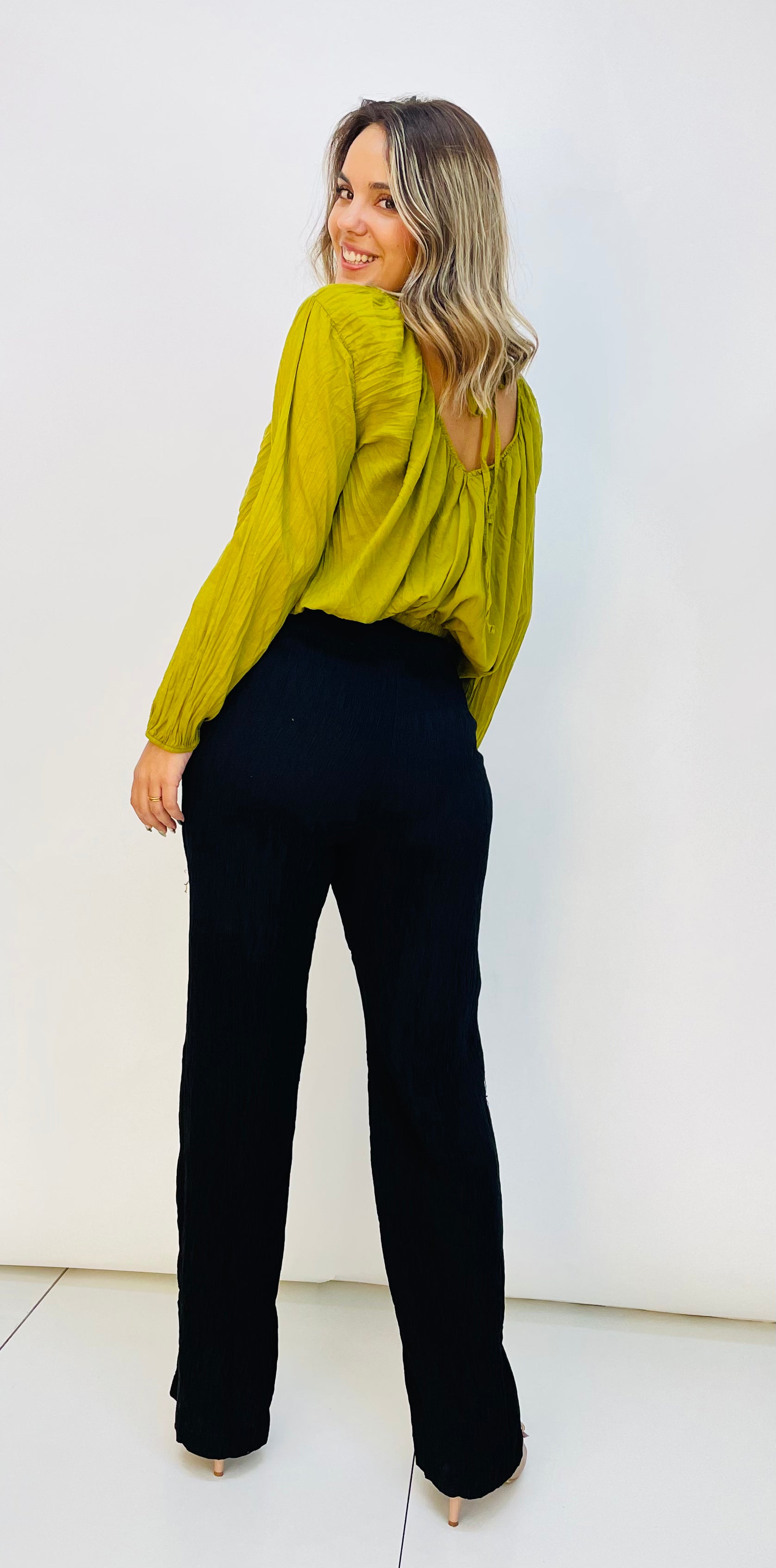 Es una blusa con escote en pico delante y detrás. Detrás lleva una lazada del mismo tejido que permite que se ate en el centro y así evitar que se desplace la manga del hombro. Es algodón y talla única. Talla desde una S hasta una L.