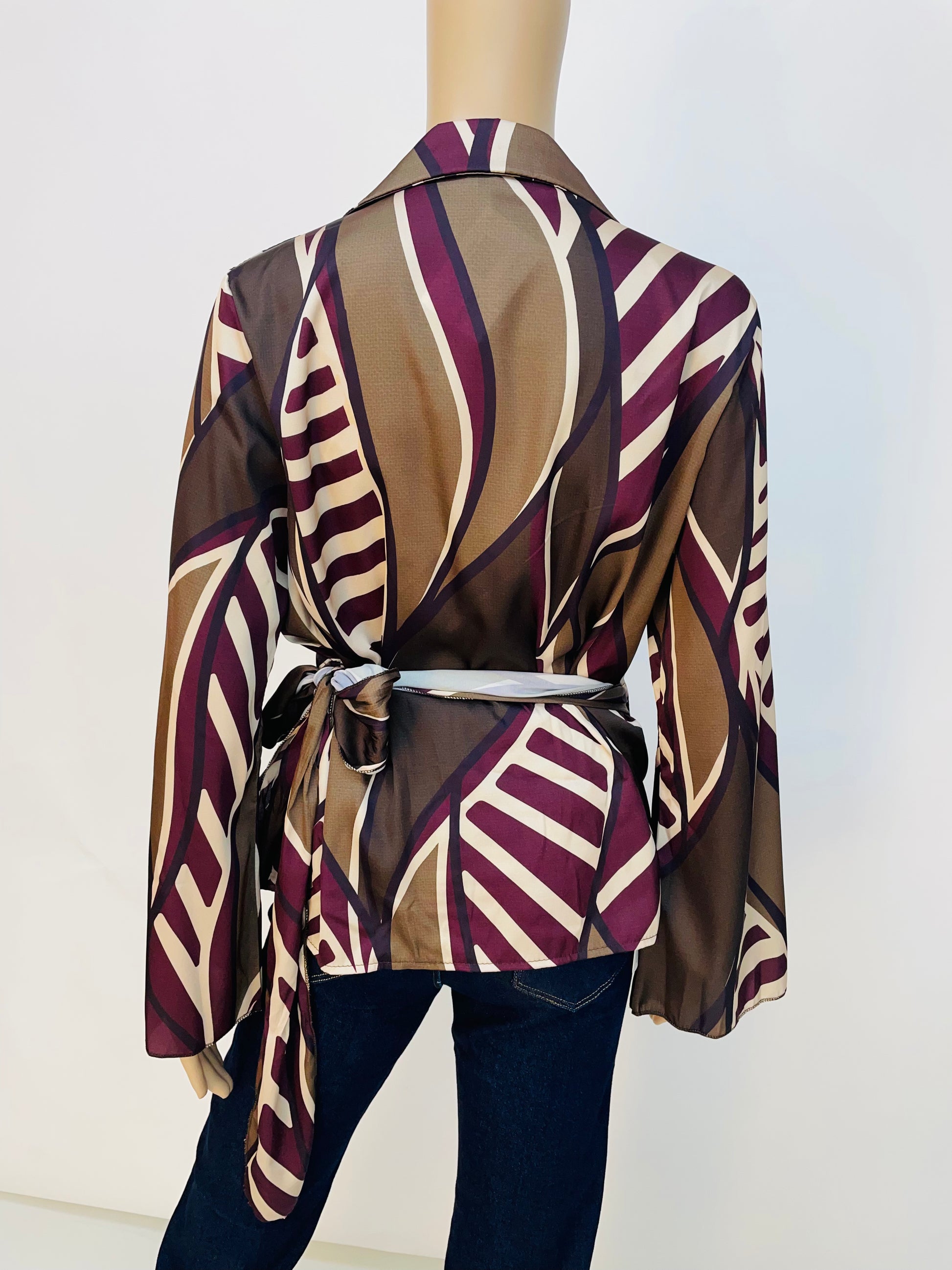 Es una blusa satinada que la cruzas en el lado. Es estampada combinada en varios colores.