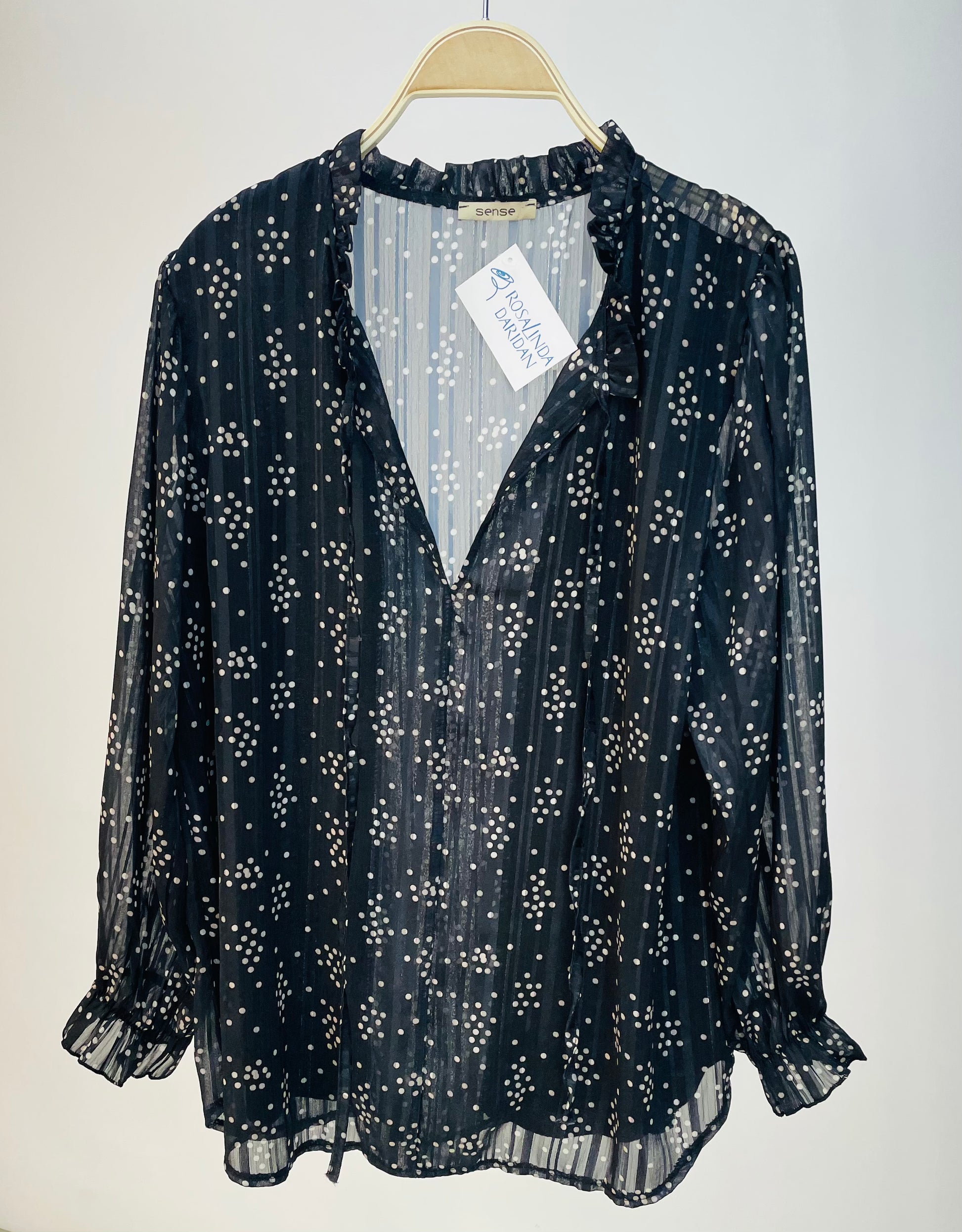 Blusa de gasa estampada de lunares con forro en la parte de delante. Lleva brillo en forma de hileras en dorado. Es talla única y talla desde la S hasta la L.