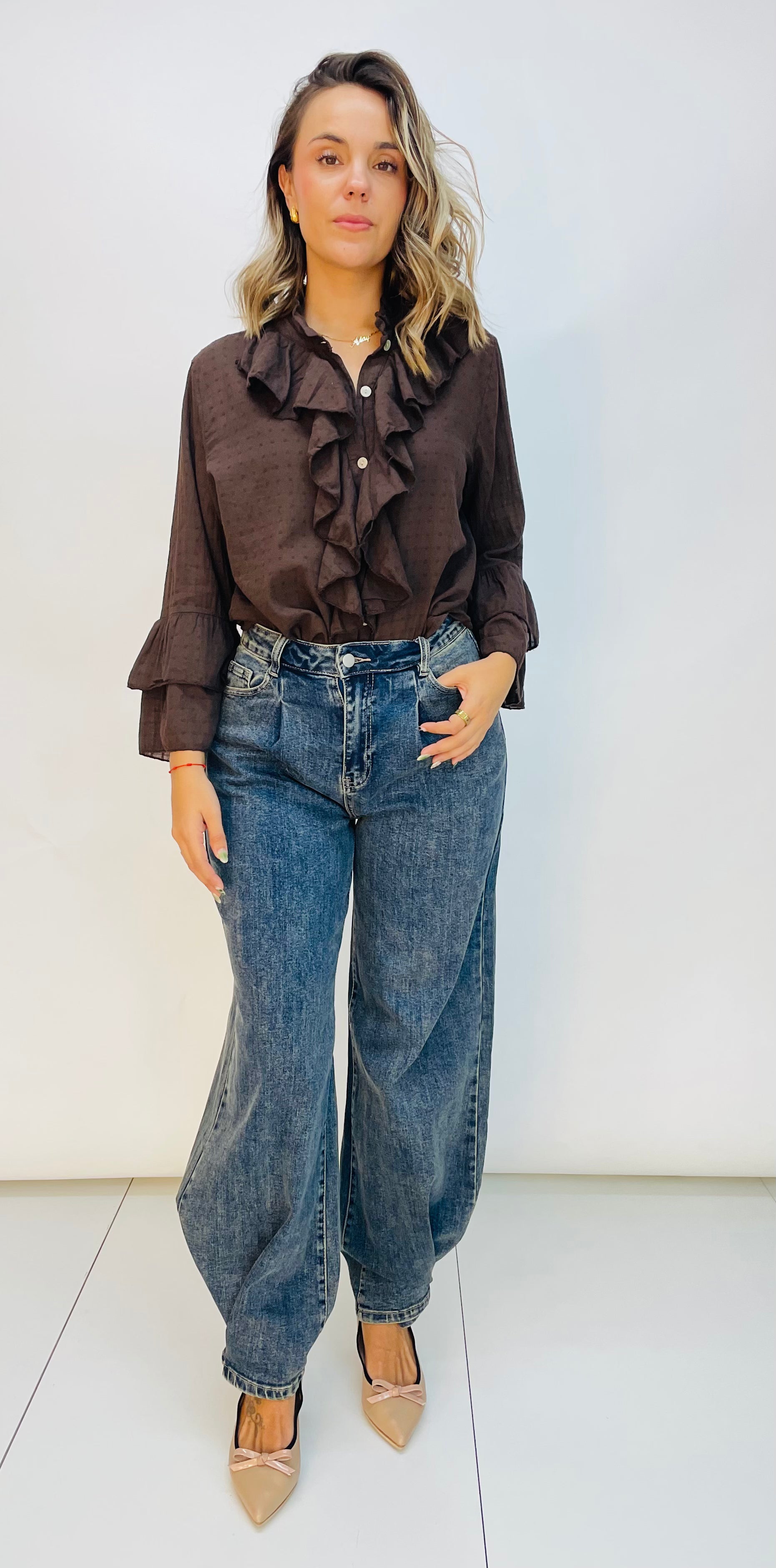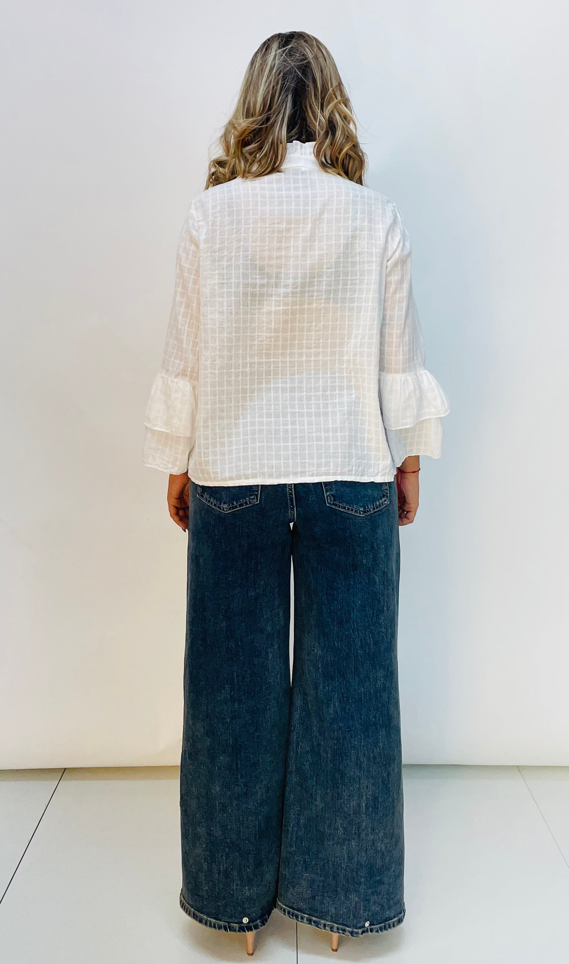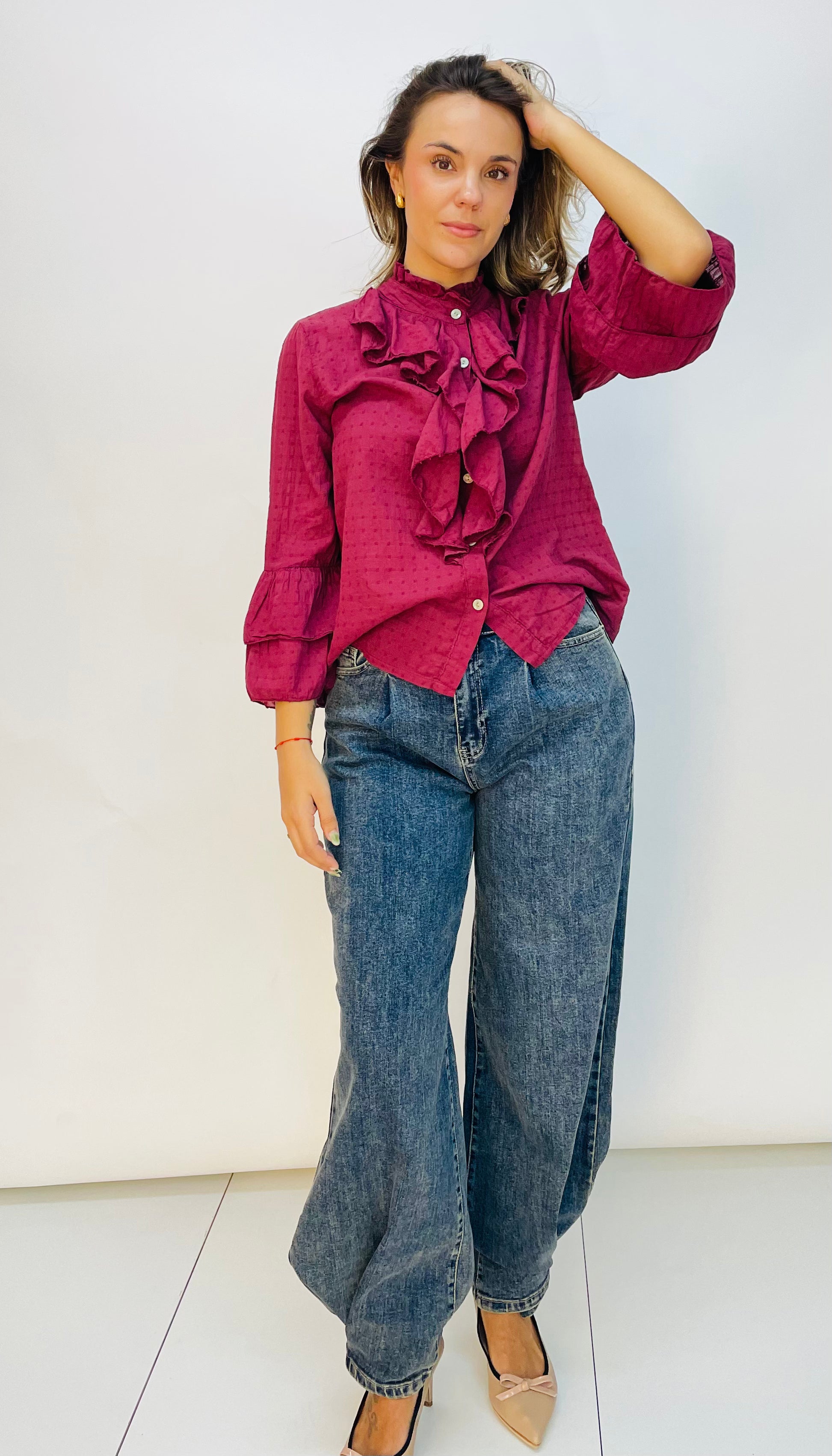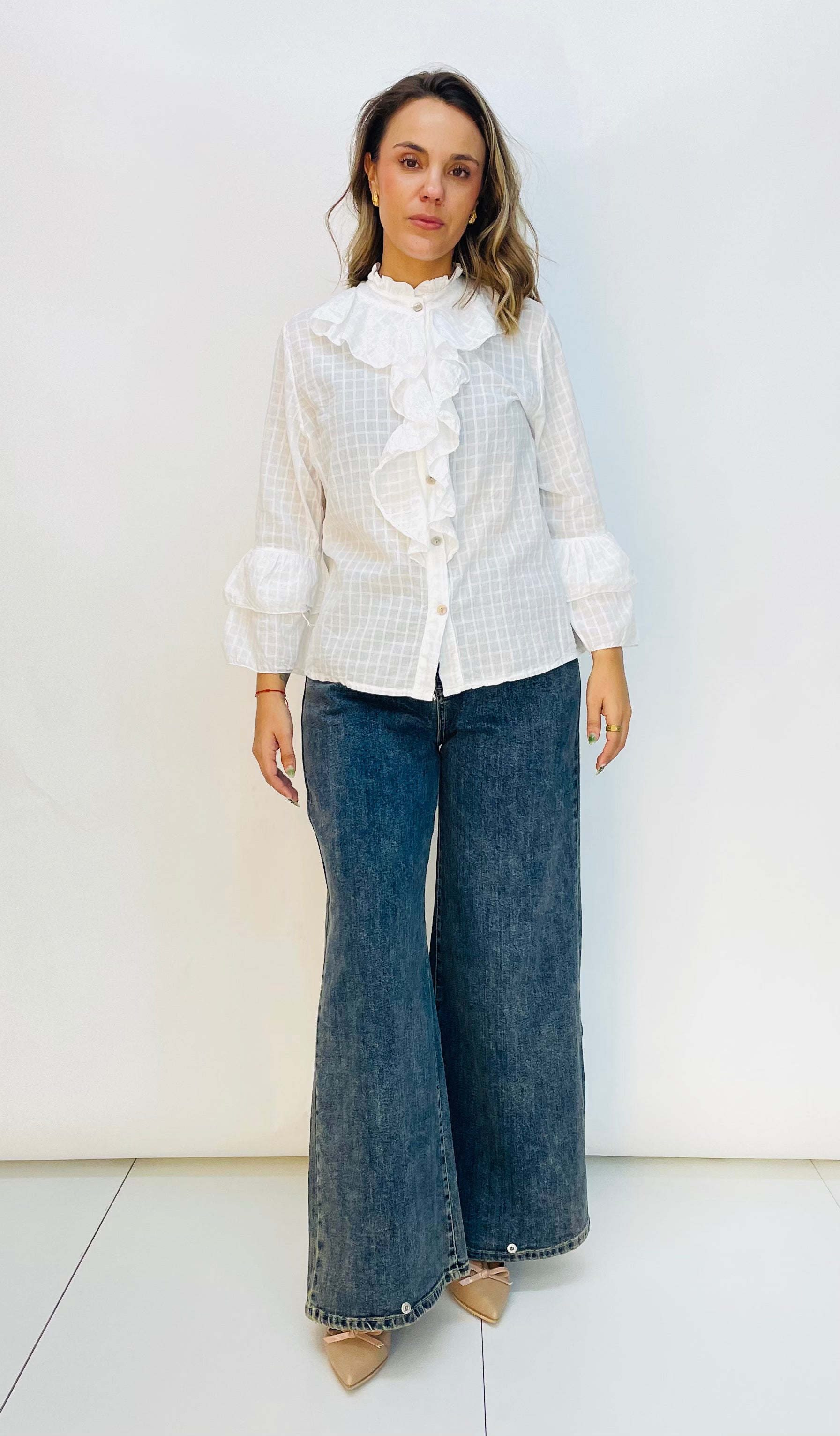 Camisa con chorreras y cuello chimenea, la tela va grabada formando cuadrados ,y las mangas son semi largas con dos volantes. Es de algodón y talla desde una S hasta una L.