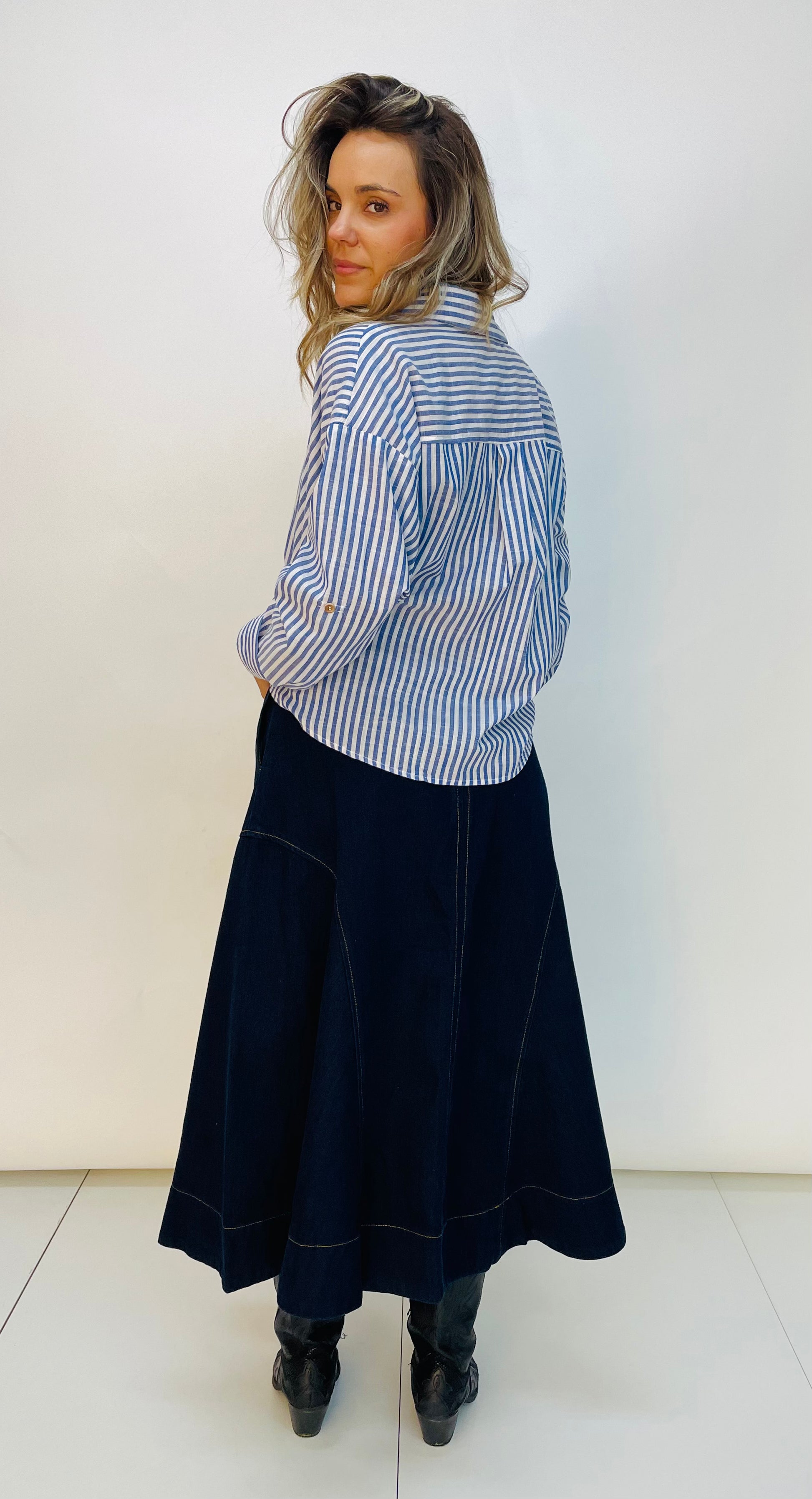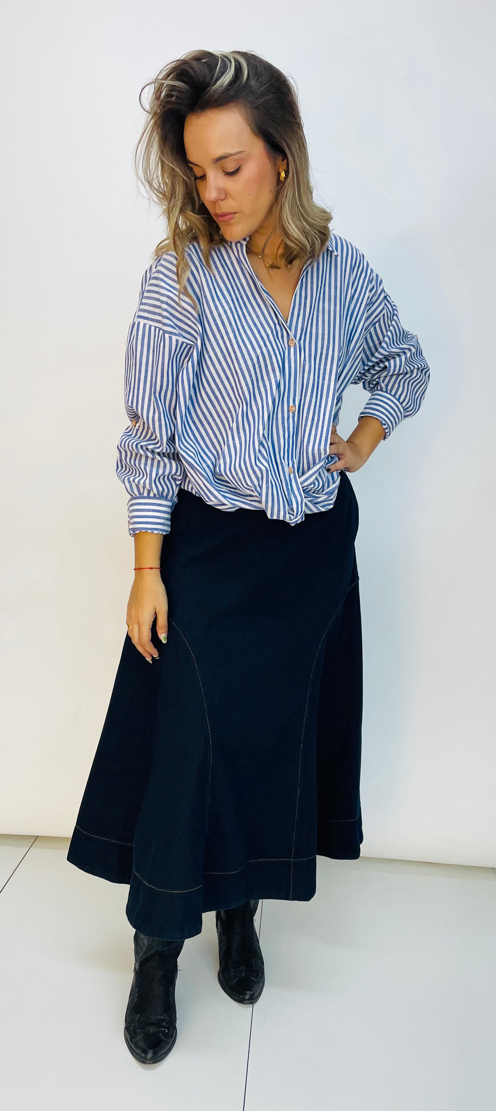 Es una camisa en rayas con la forma anudada en la cintura. Queda holgada y semi corta. Es algodón y talla desde una S hasta una XL. Manga con puño y boton para convertir.
