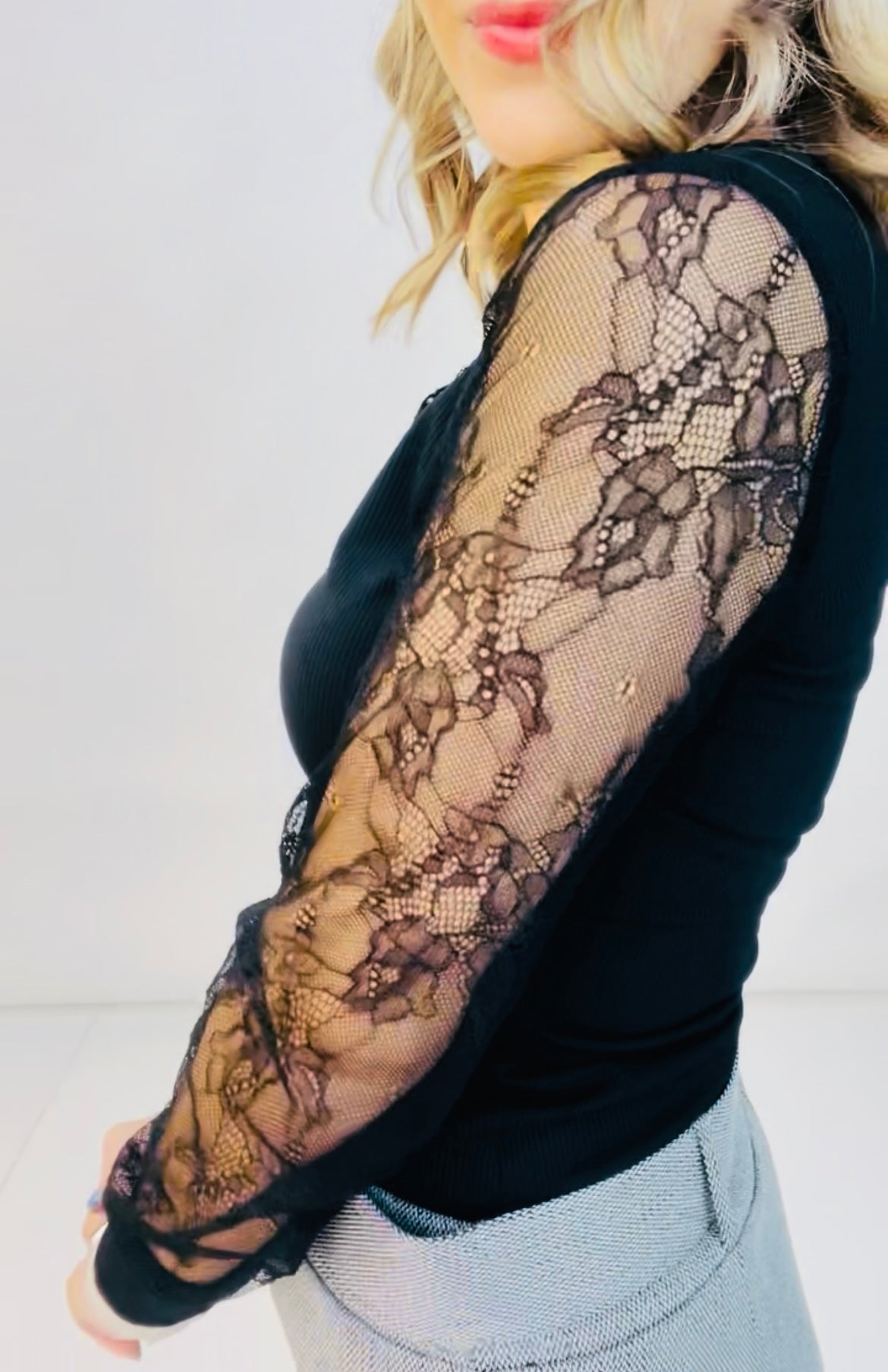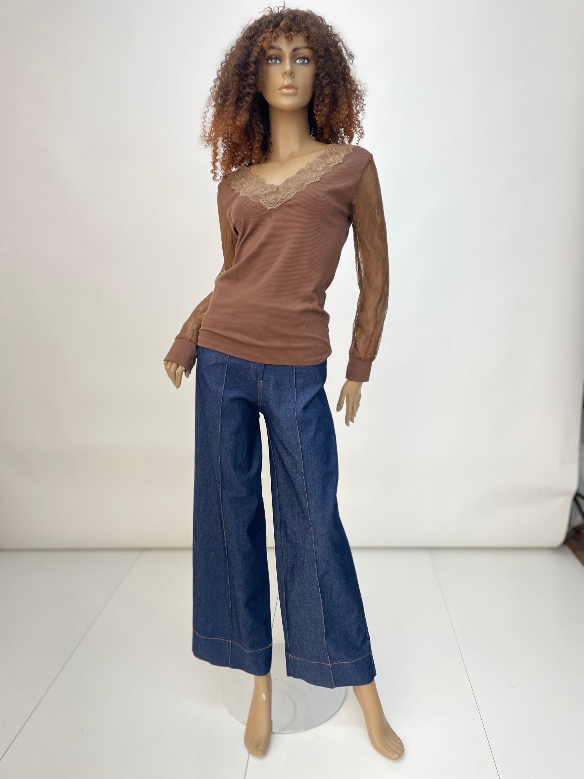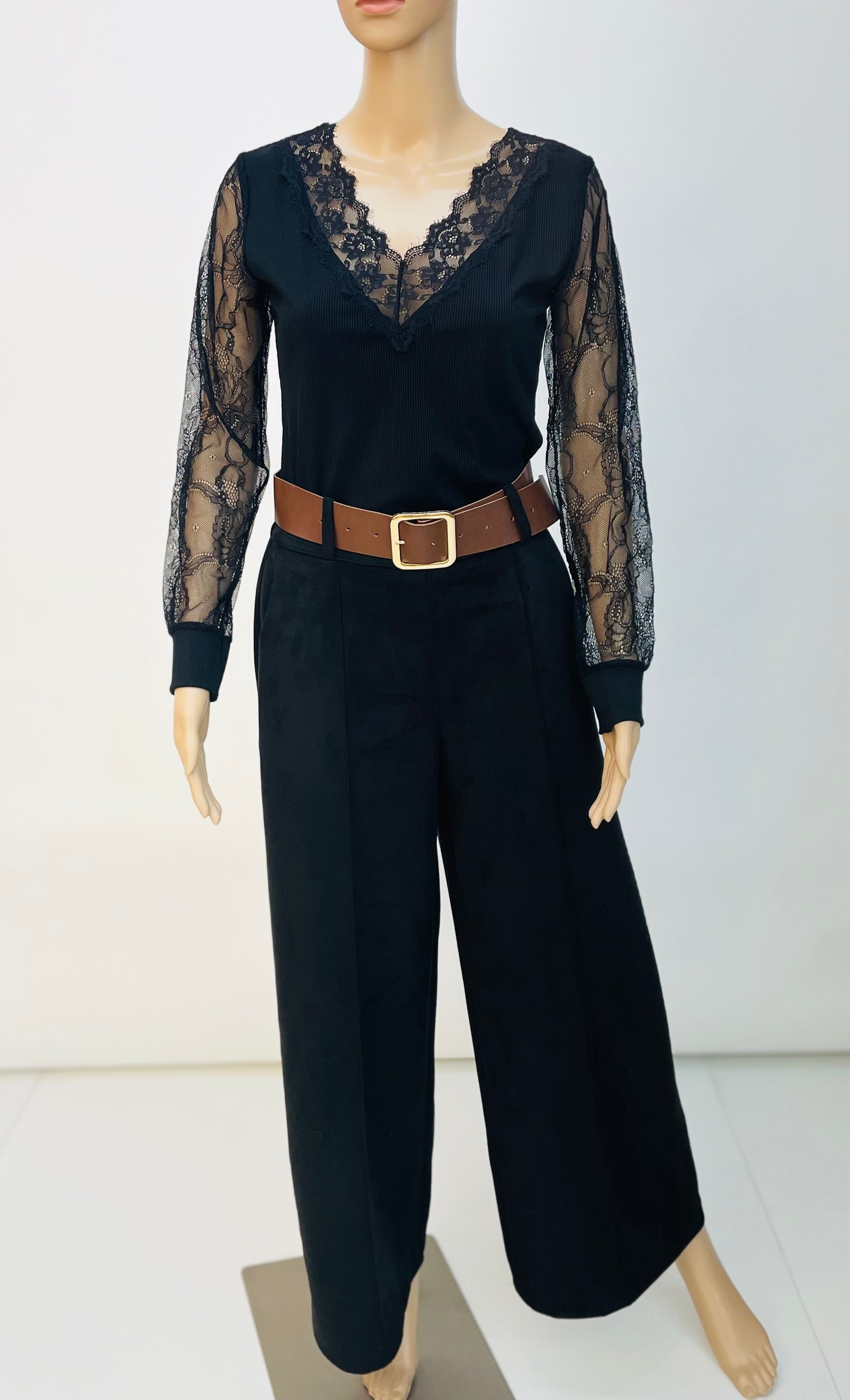 Camiseta en punto de canalé entallada, mangas y escote con puntilla transparentes. Escote pico. Es de tacto muy suave y muy elástico. Talla única y talla desde una S hasta una L.