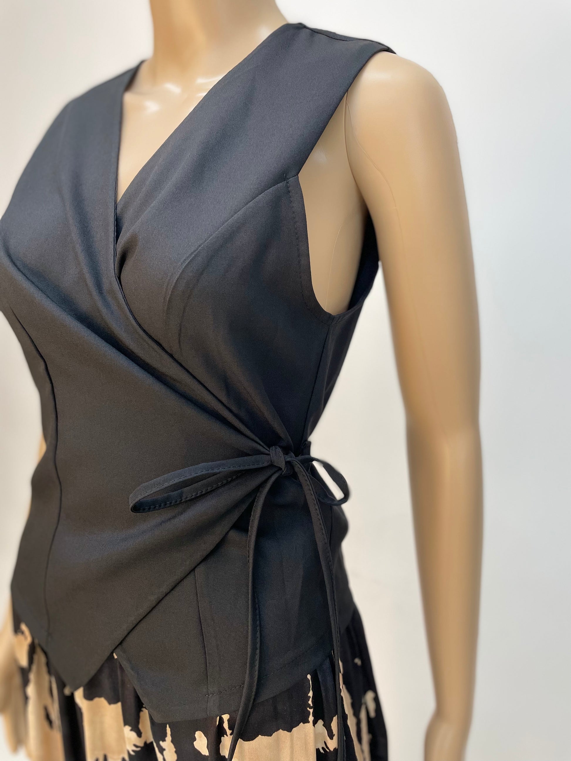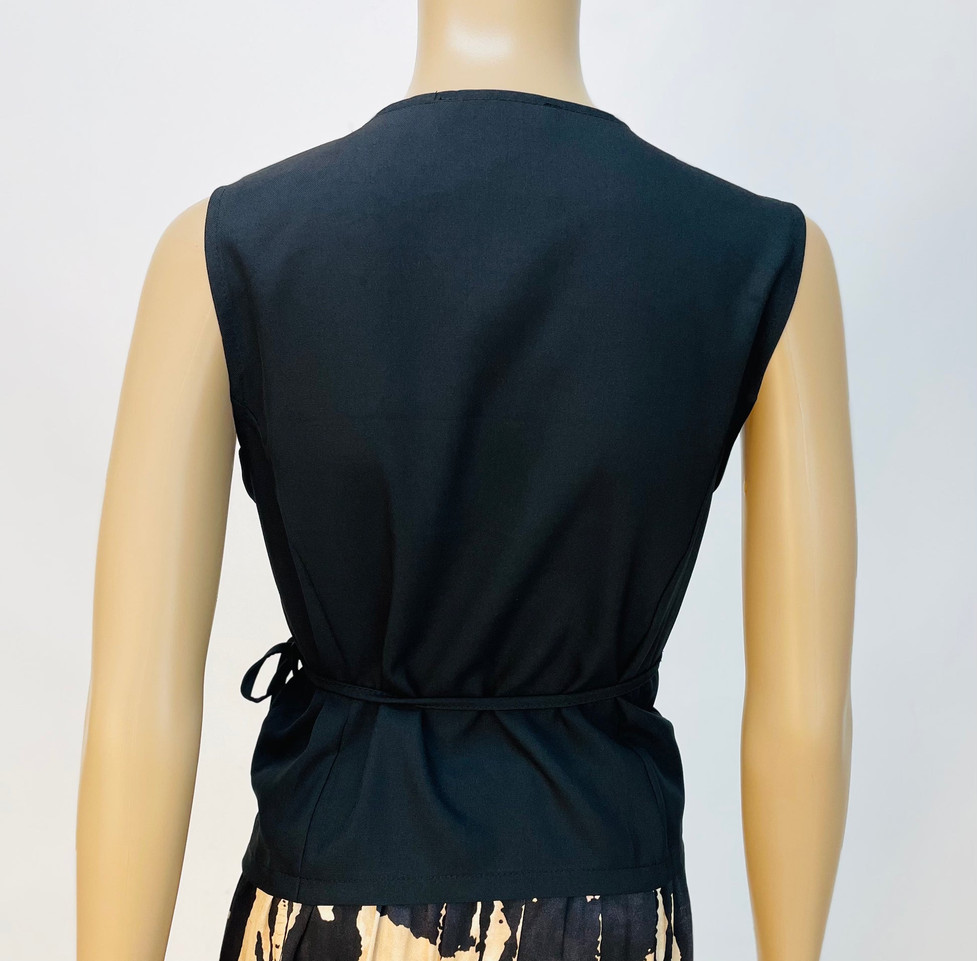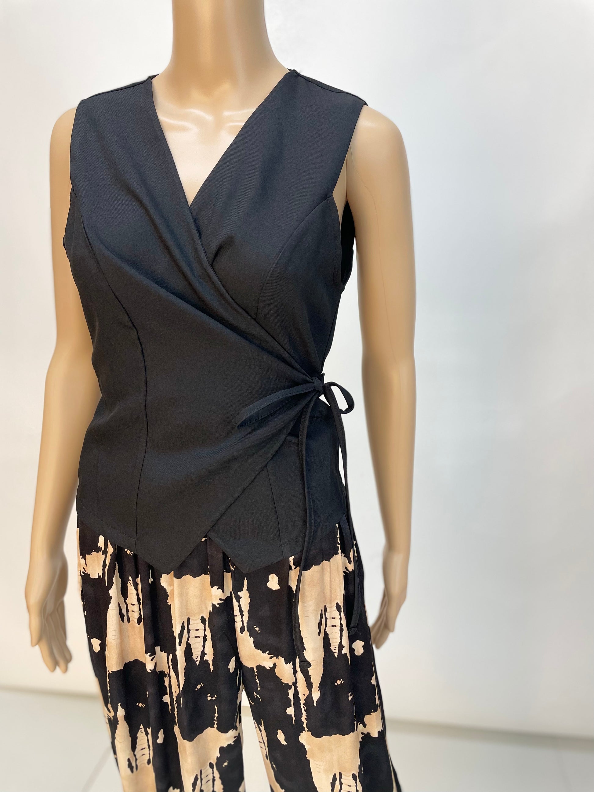 Es un chaleco donde te permite cruzarlo adaptando el entalle a tu cuerpo. Talla única y talla desde la S hasta la L.