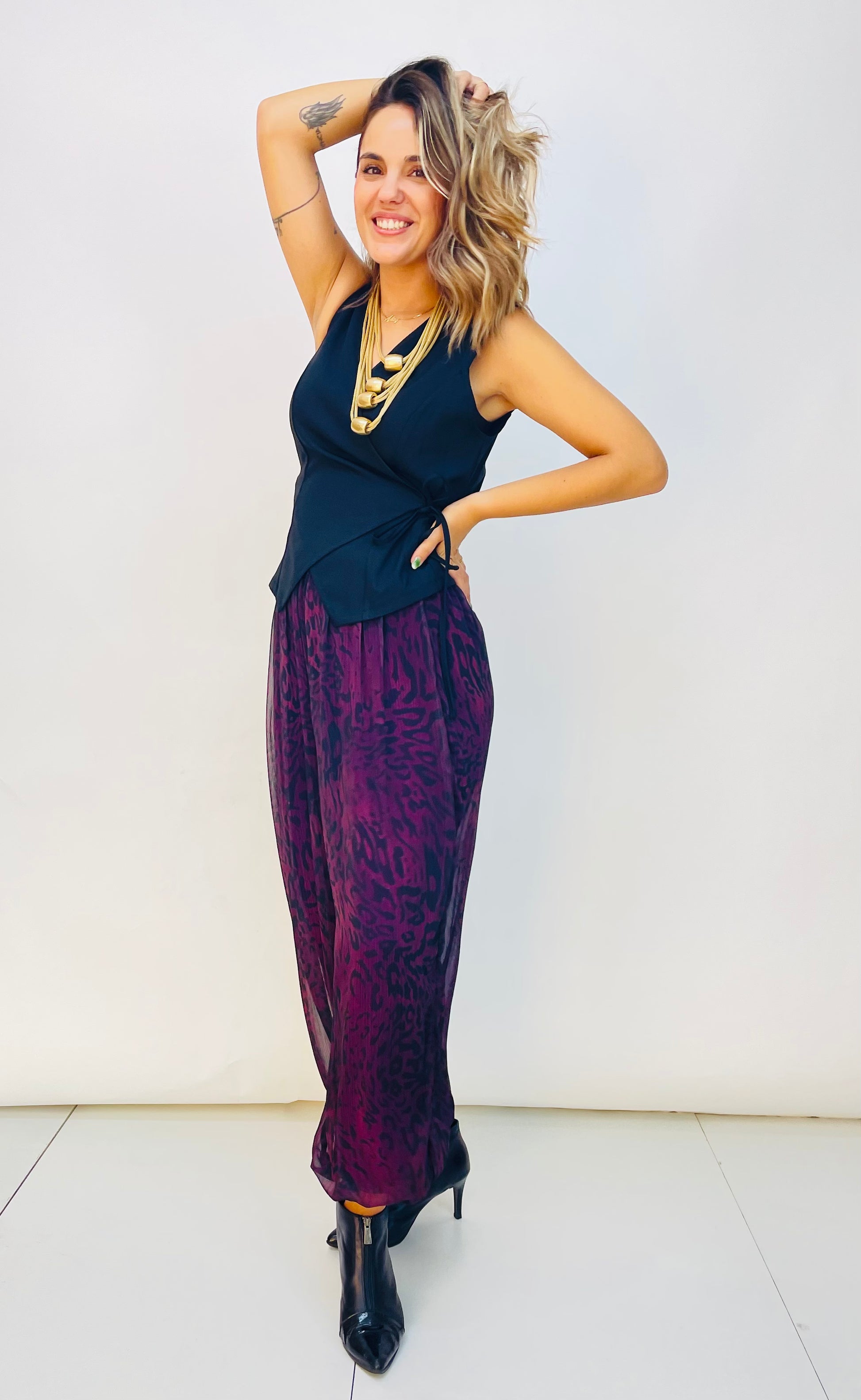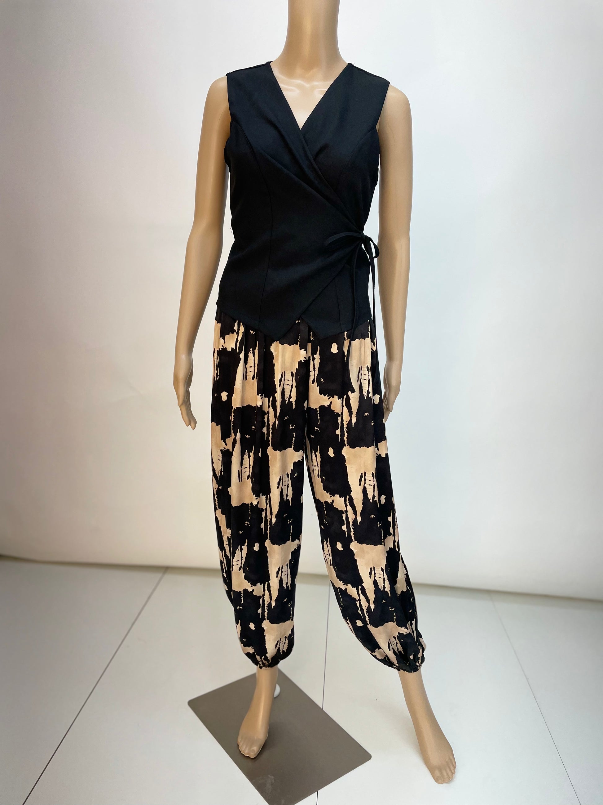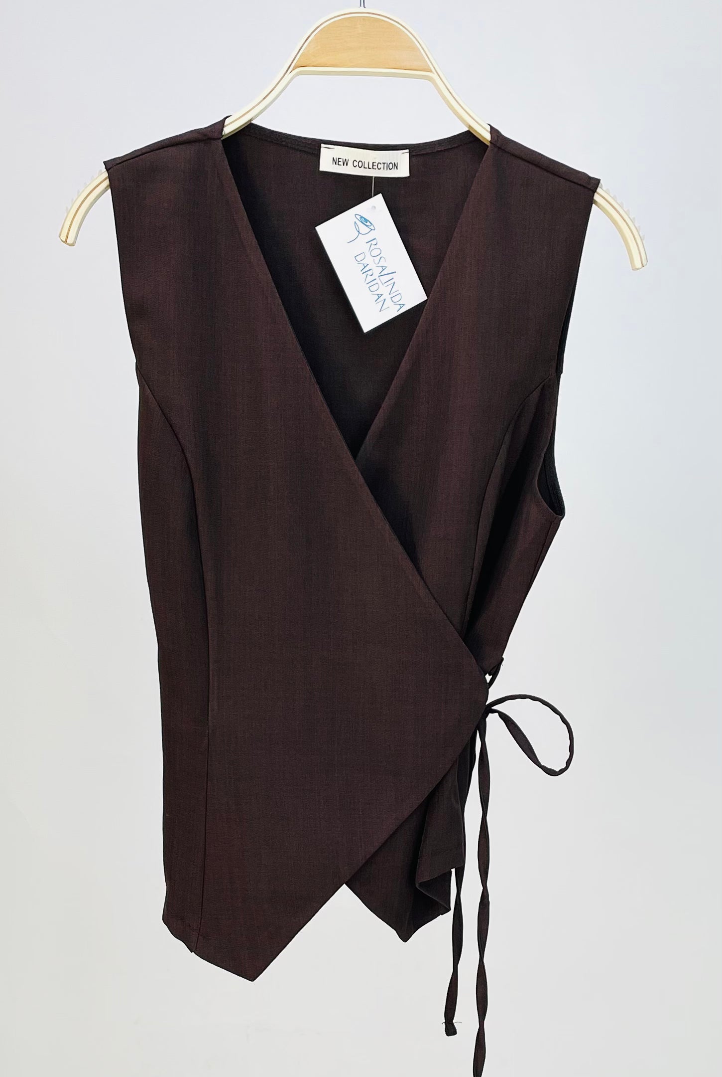 Es un chaleco donde te permite cruzarlo adaptando el entalle a tu cuerpo. Talla única y talla desde la S hasta la L.