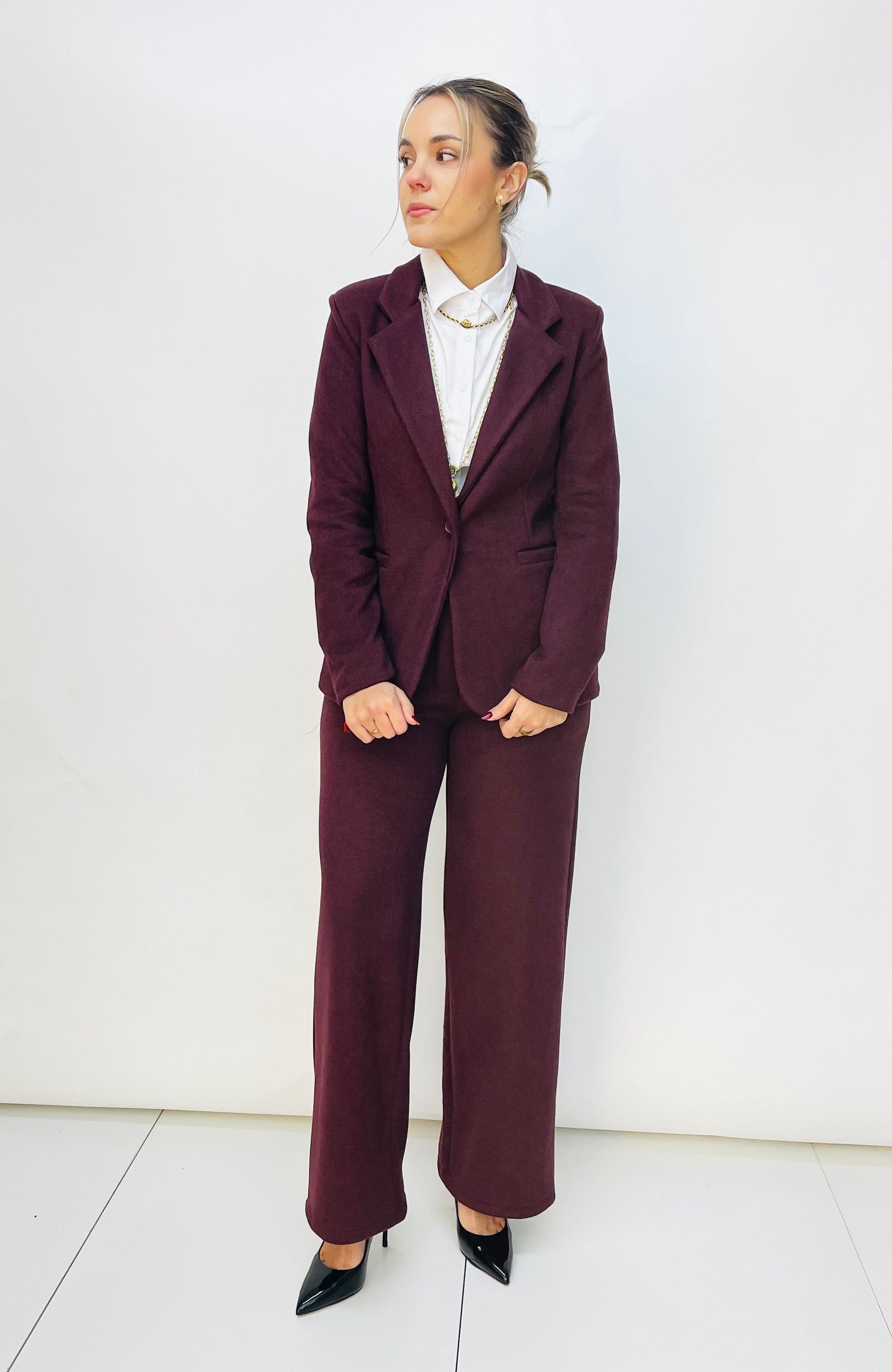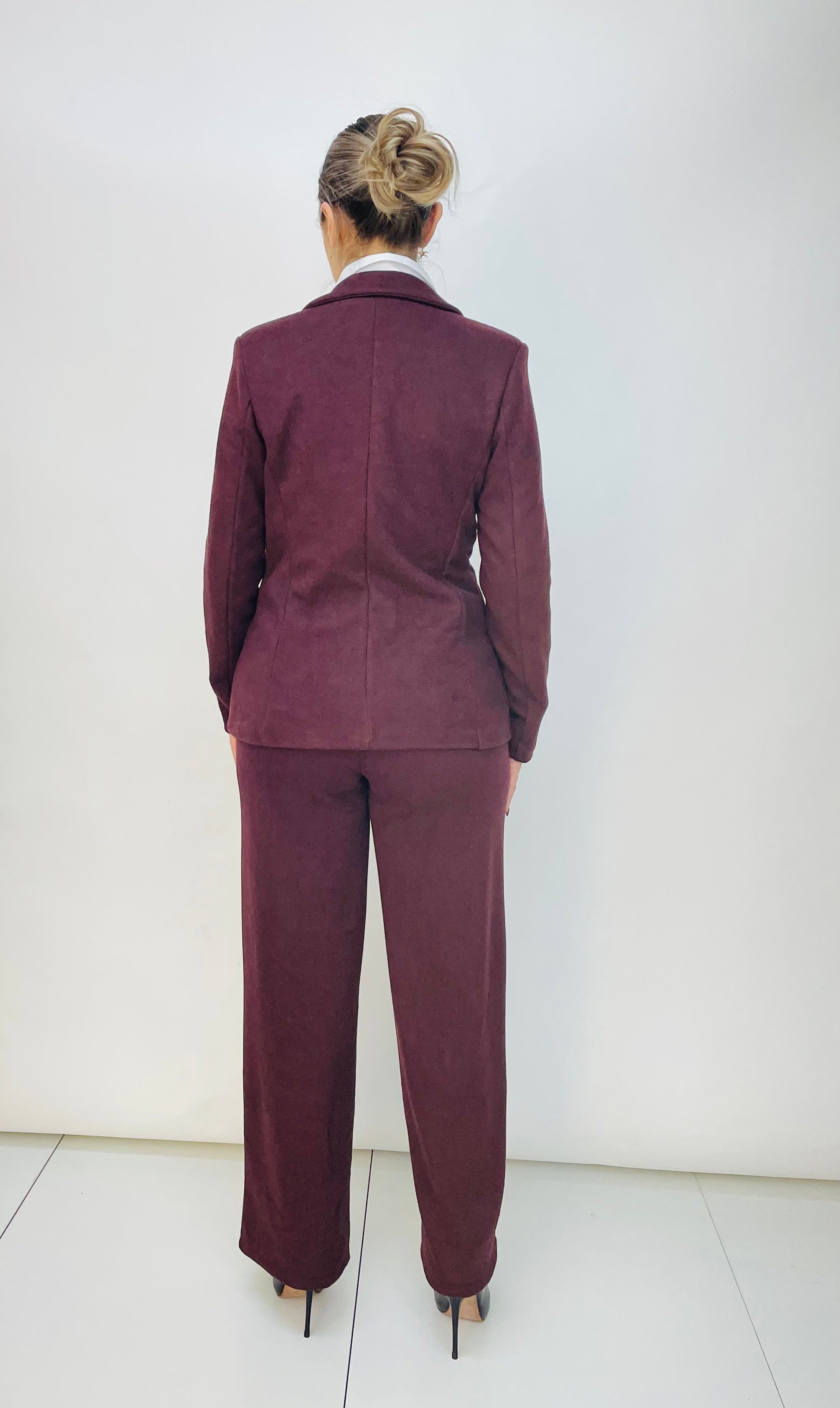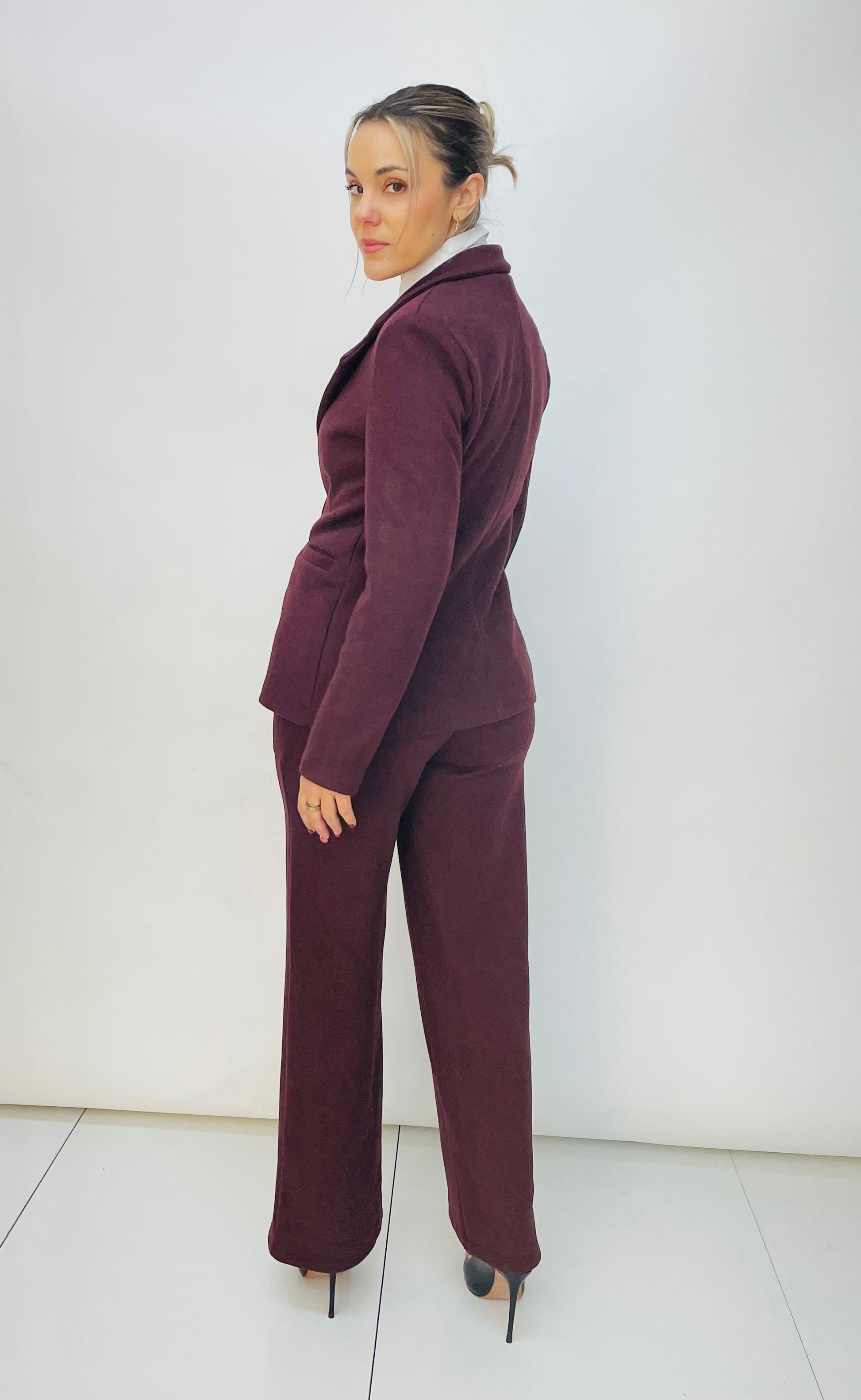 Es una Americana de traje en franela. Va forrada en interior. Es entallada y lleva costura delantera con bolsillo simulado y tres costuras traseras donde da forma al entalle. Se abrocha con un botón.
