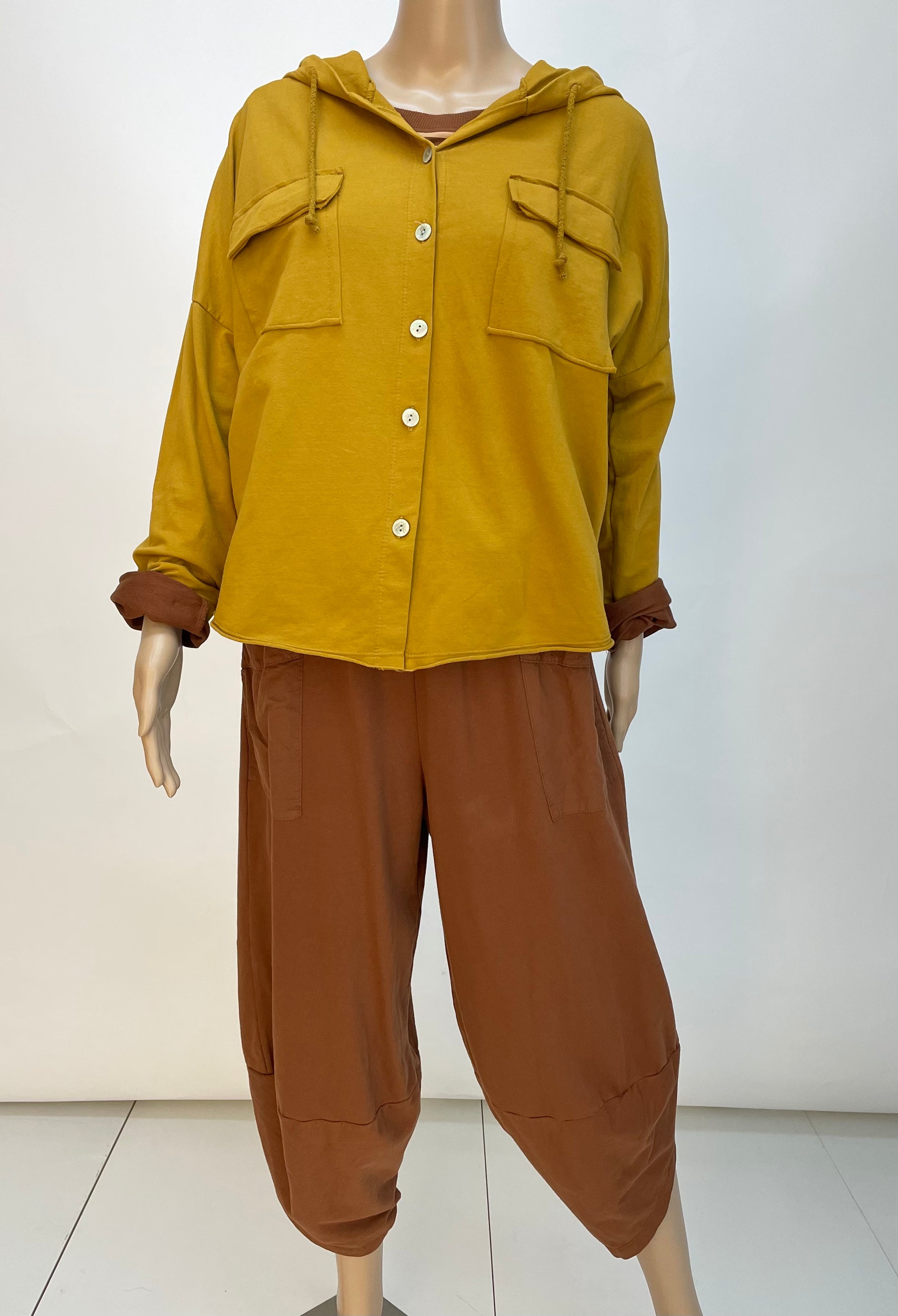 Es una chaqueta algodón con capucha, se abrocha con botones y lleva bolsillos en la parte de delante. Es Over size y talla única. Talla desde una S hasta una XL que equivale a una 42.