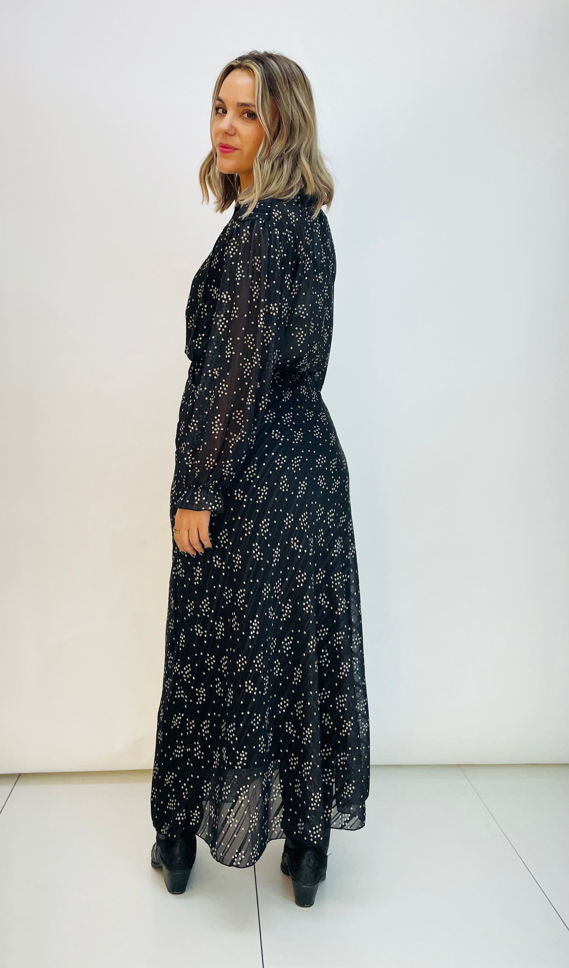 Falda larga en gasa estampada en lunares con forro interior y goma en la cintura. Talla única y talla desde la S hasta la L.