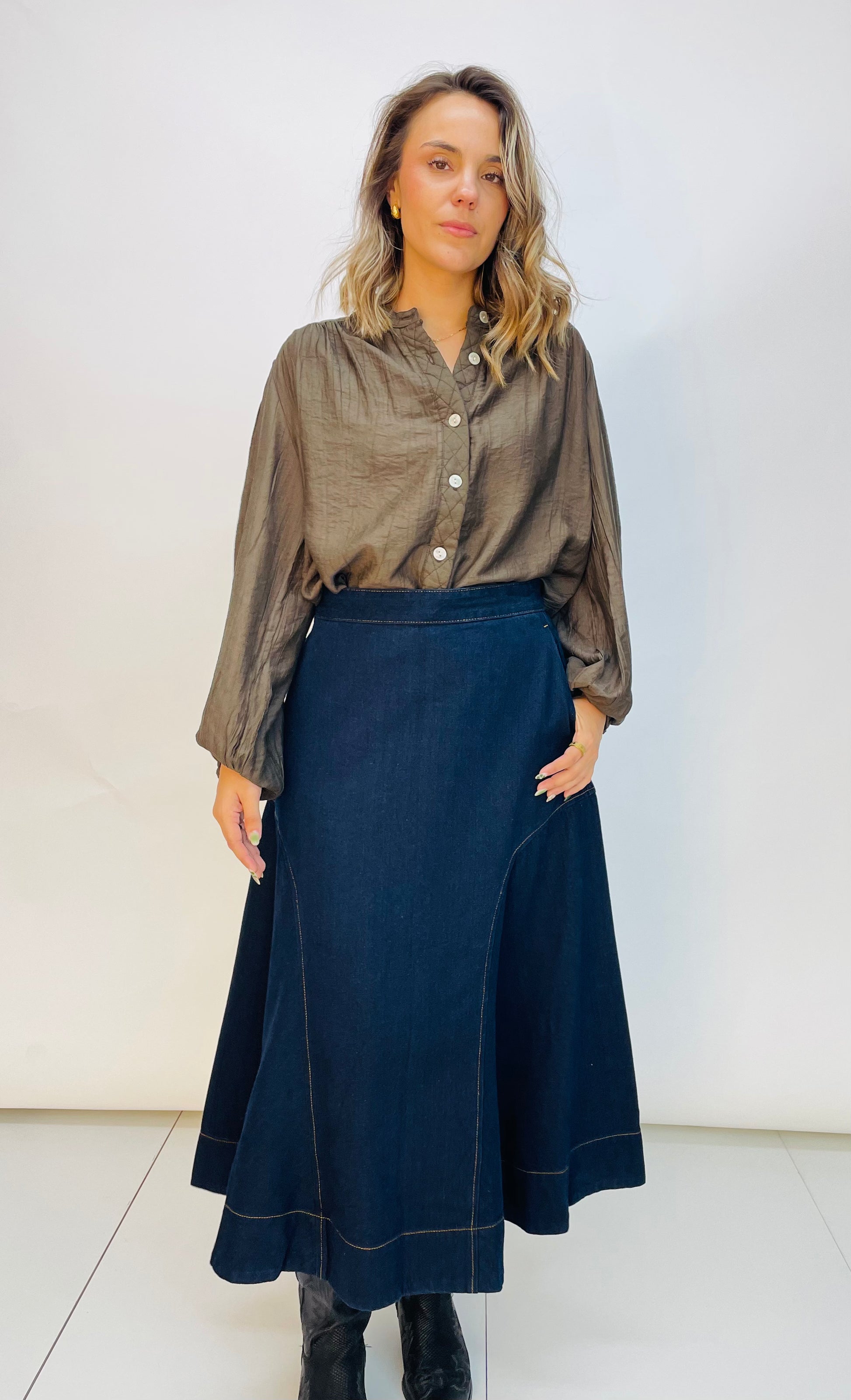 Es una falda vaquera midi. Se abrocha con cremallera dorada detrás. Con prespunte en un tono crudo que contrasta con su color azulon de la falda. Lleva bolsillos en lados y su acabado es en evasé