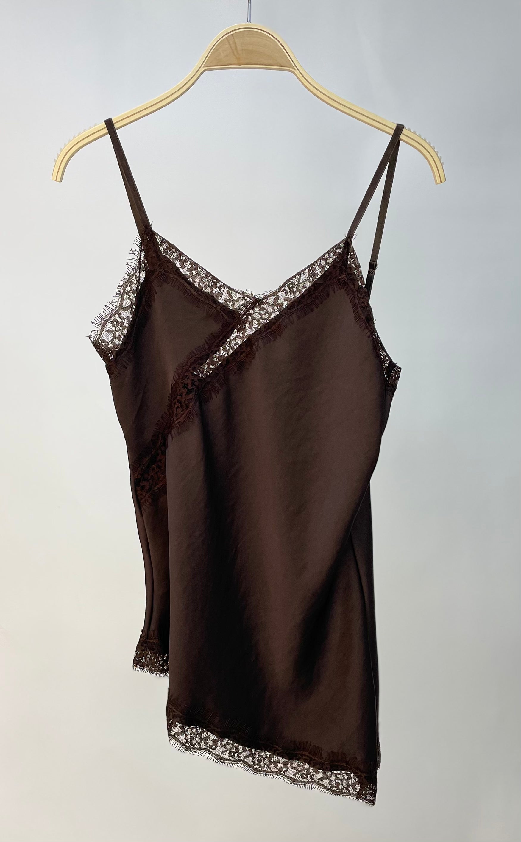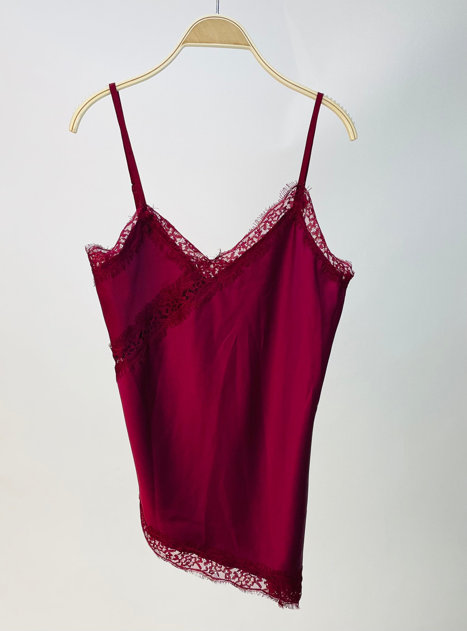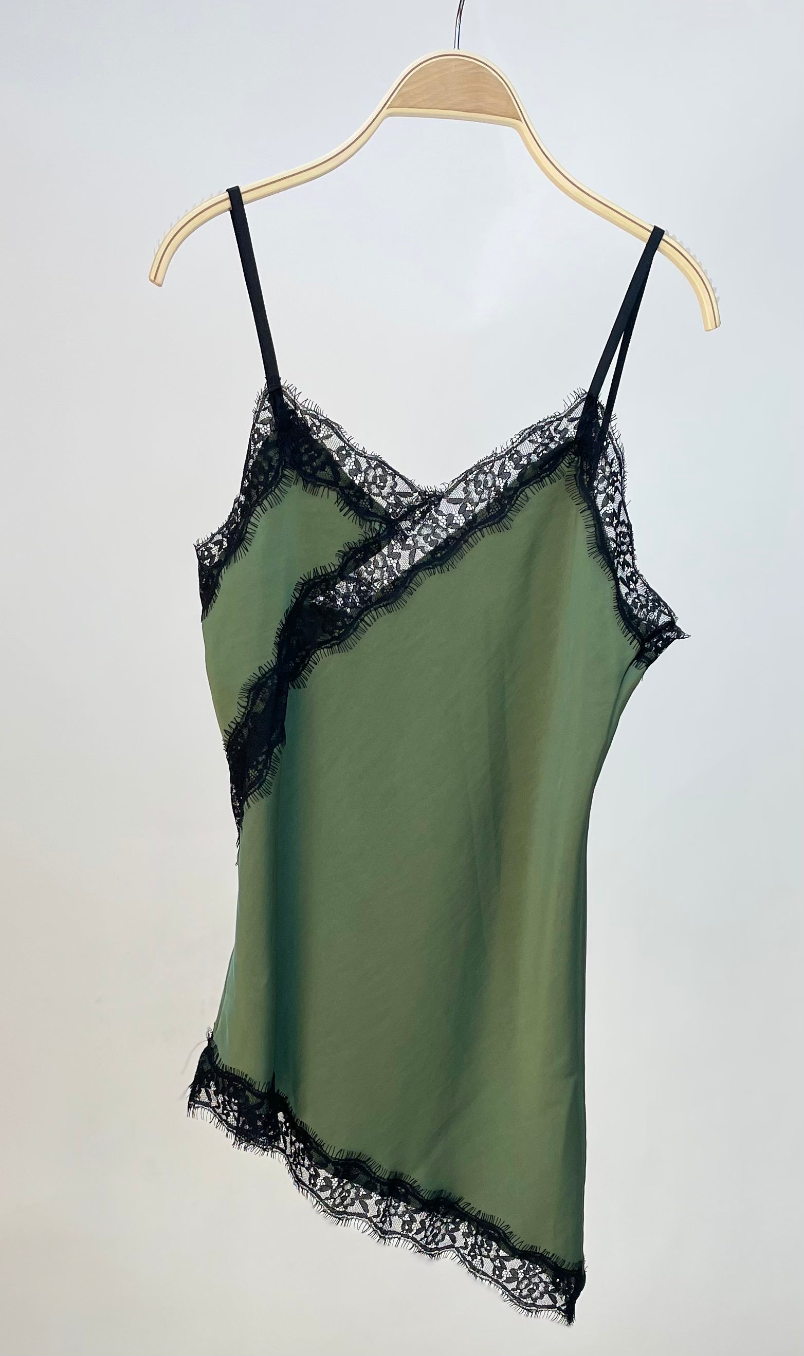 Es una lencera satinada asimétrica, con encajes y tirante regulable.