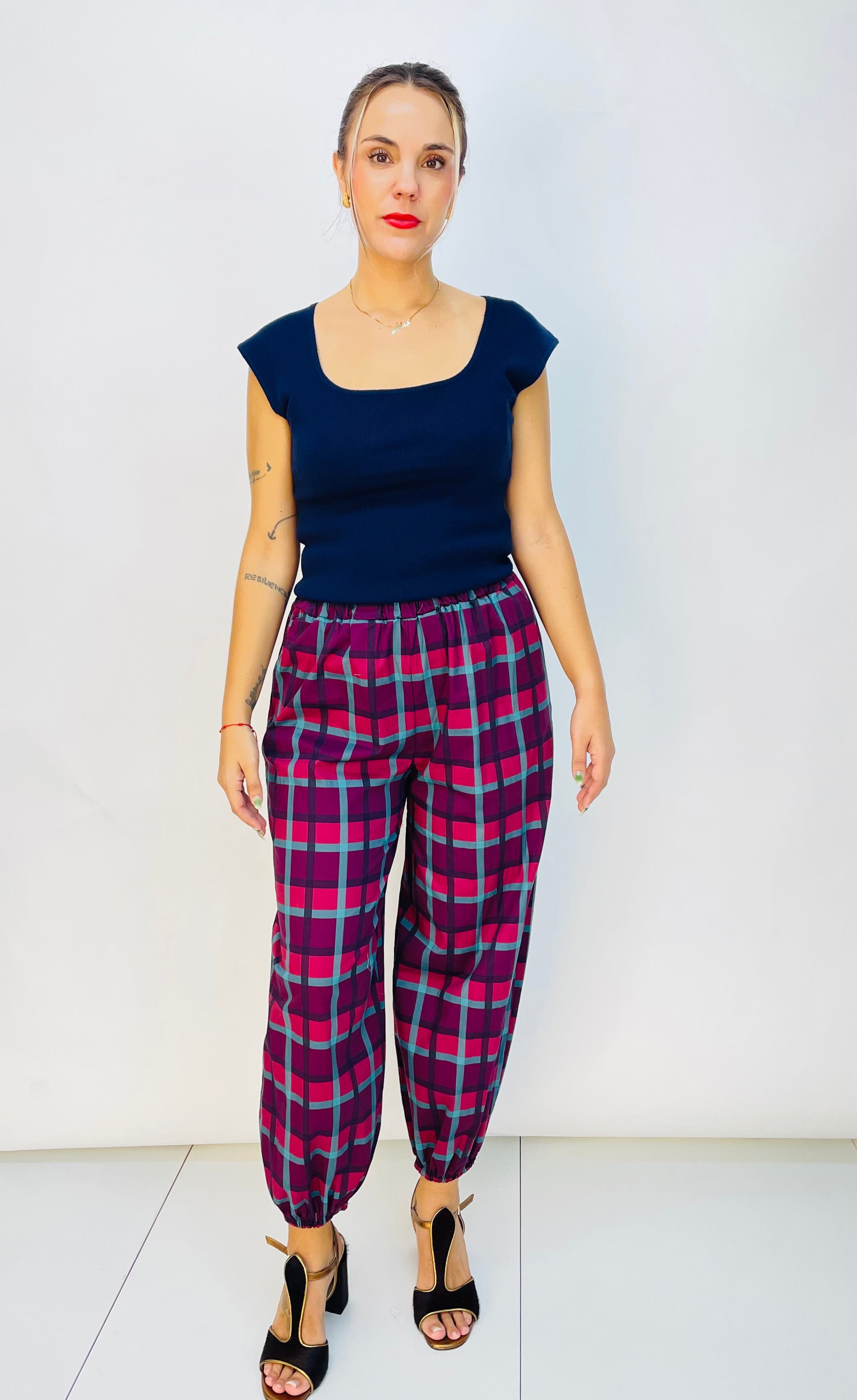 Es un pantalón estampado en cuadros con goma en cintura y tobillos, lleva bolsillos en los lados y es talla única. Talla desde una S hasta una L.
