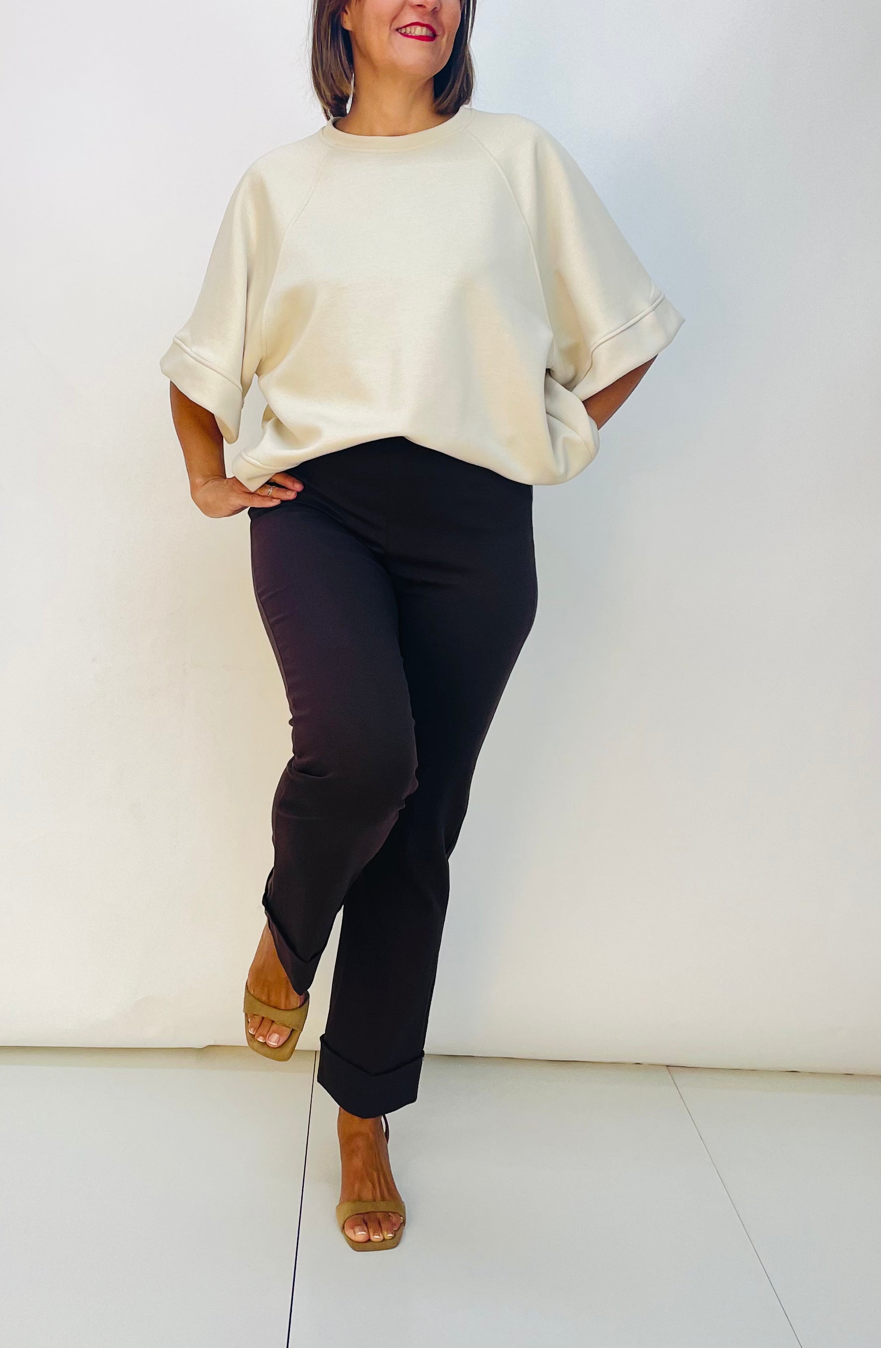 Es un pantalón recto con vuelta en el bajo y cinturilla elástica invisible.
