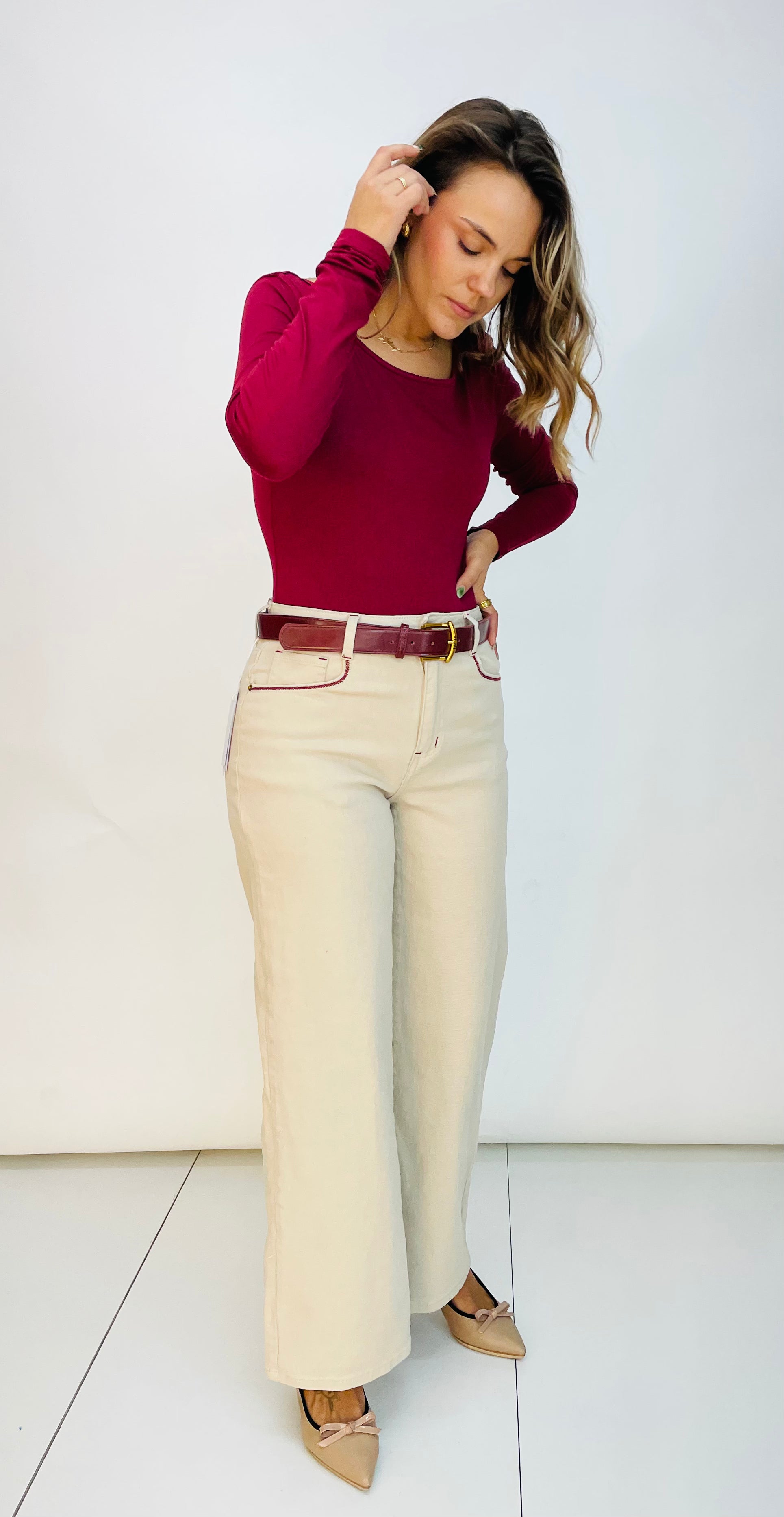 Es un vaquero en beige que lleva en los bolsillos de delante unos prespuntes en granate, y otro prespunte solo en un bolsillo de detrás, dando un efecto más moderno. Es de camal recto, y va incluido un cinturón del mismo color del prespunte.