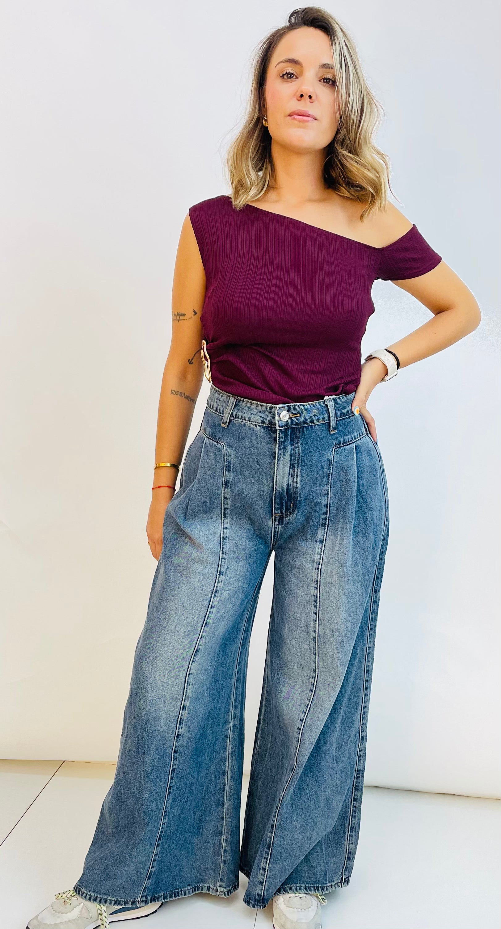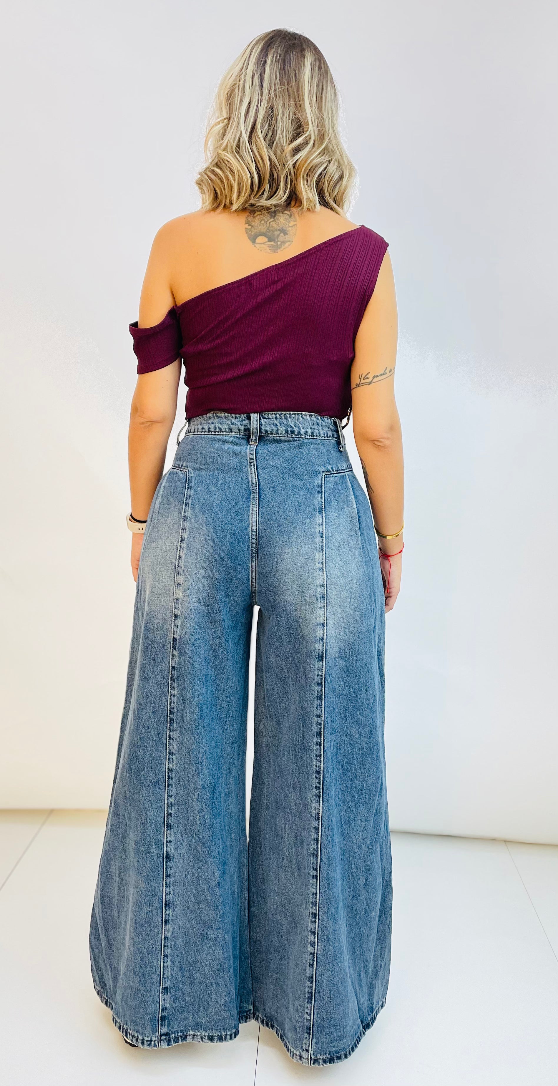 Vaquero palazzo con pinzas delante y detrás. Lleva costura en cada pierna delante y detrás. Es tiro alto, lo cual define cintura.