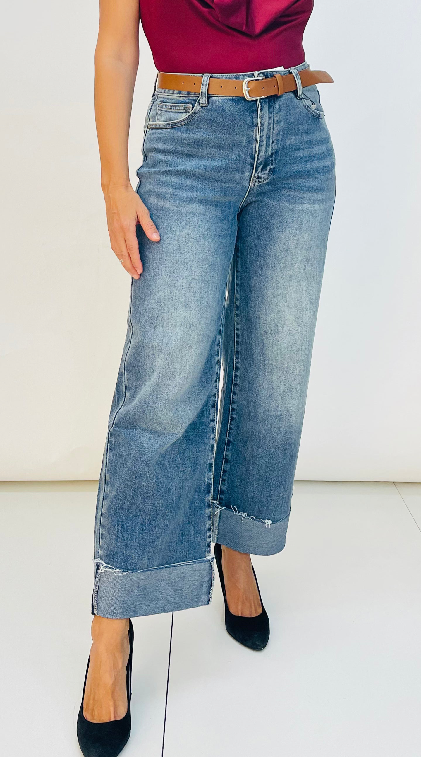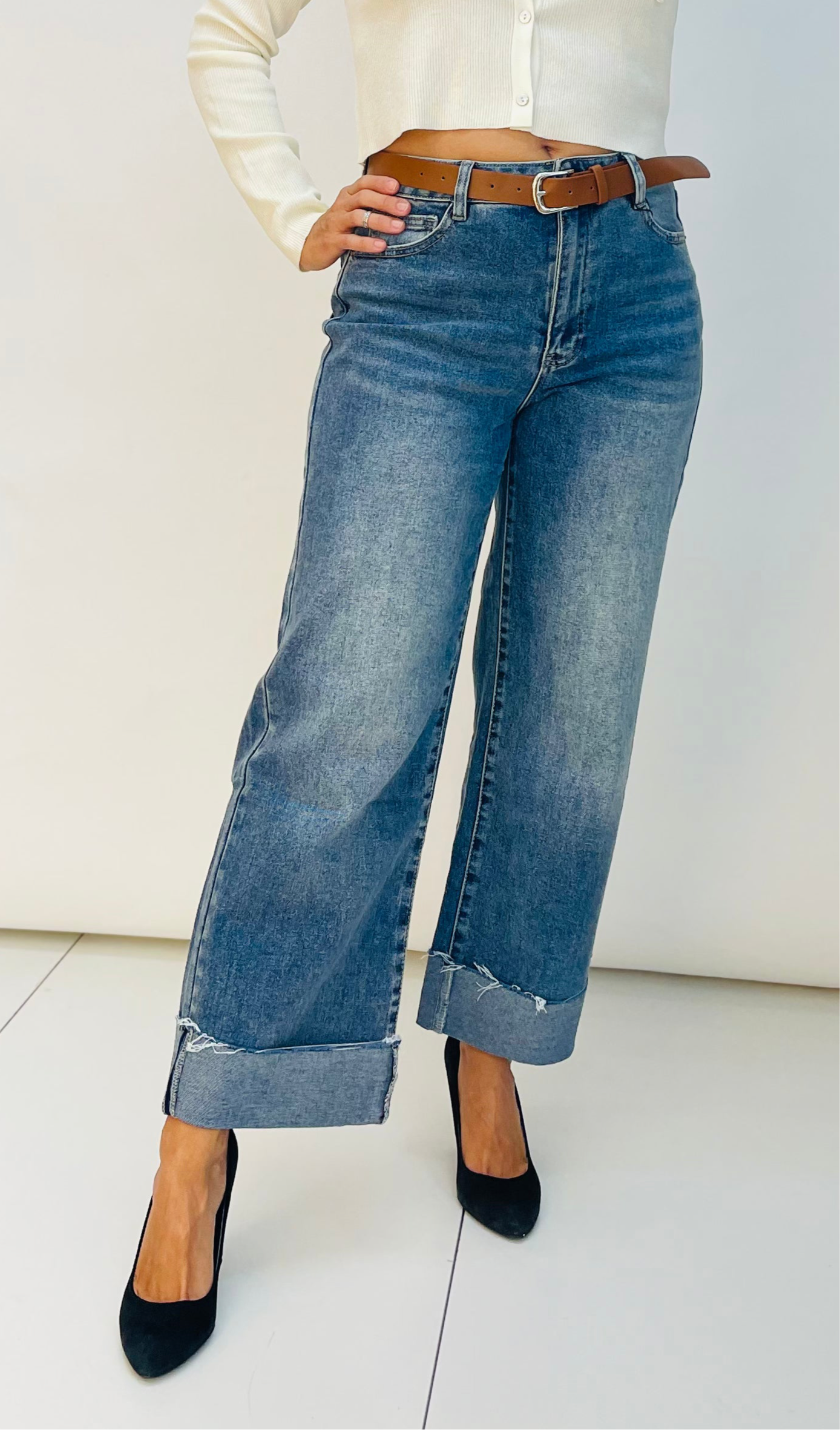 Vaquero recto con vuelta en el bajo y tiro alto.Detalle de cinturón en color cuero.