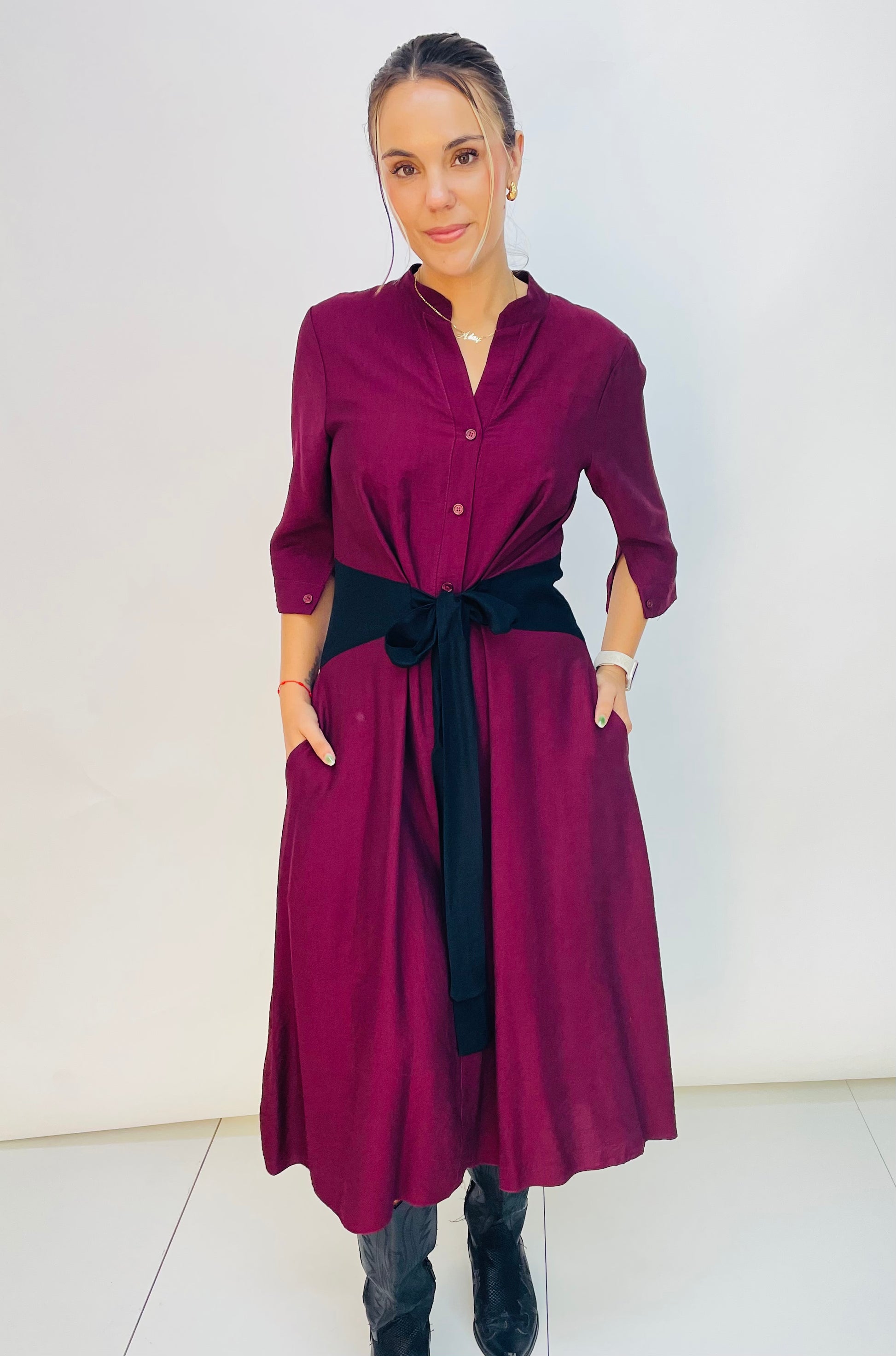 Es un vestido camisero con una lazada que se entalla en la cintura en la parte de delante, donde permite ajustarla y definirla. Lleva bolsillos en los lados y es manga al codo.