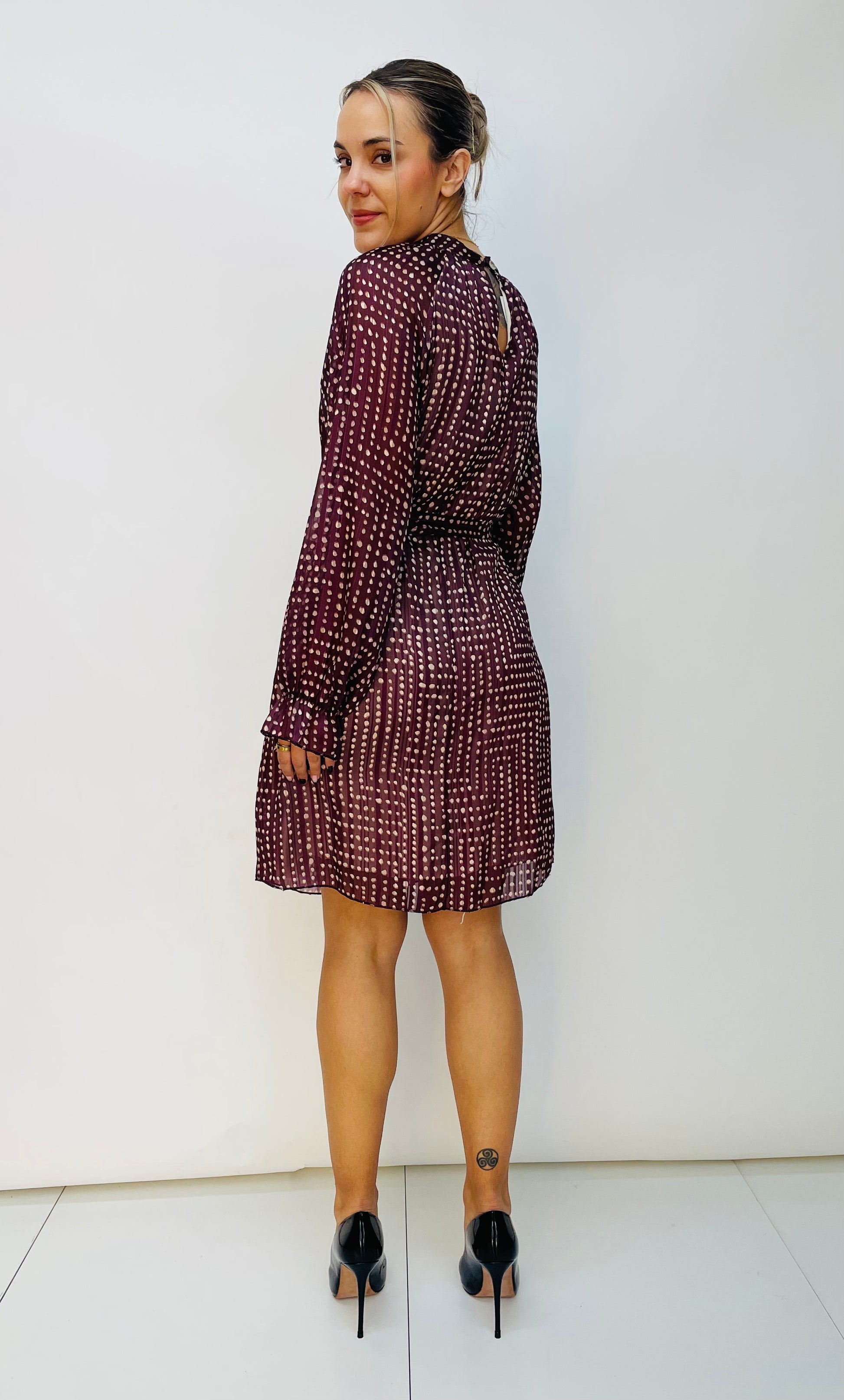 Es un vestido de gasa con forro interior. con cuello formando unas pequeñas pinzas en mao. Es estampado con topitos blancos . El puño de la manga fruncida con goma y transparente. Lleva en la tela hilos dorados en brillo. Lleva cinturón del mismo textil.