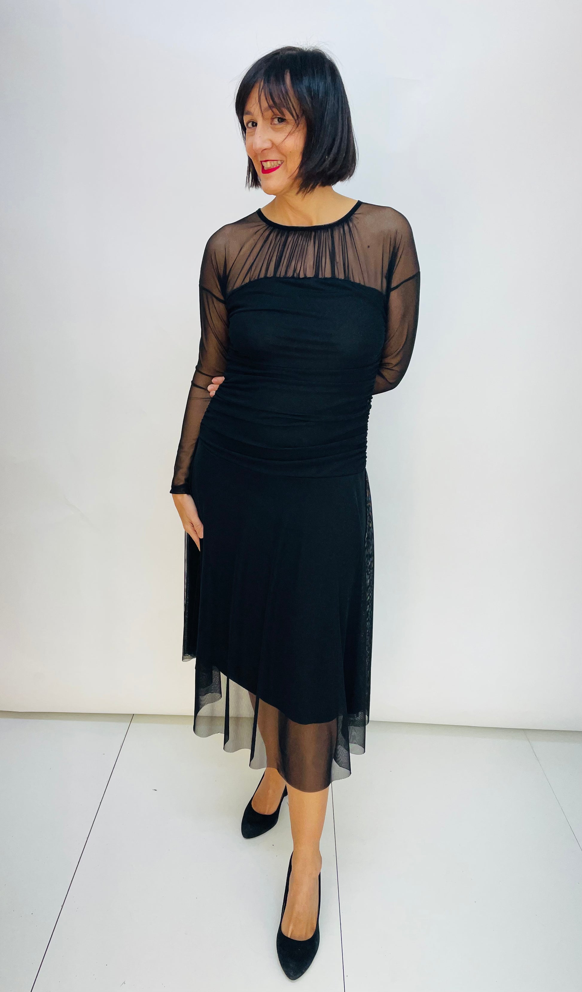 Vestido tul con escote cuello caja, y drapeado también en escote y toda la parte delantera hasta la cadera. Falda vuelo y mangas semi transparentes. Es talla talla única y talla desde la S hasta una XL.